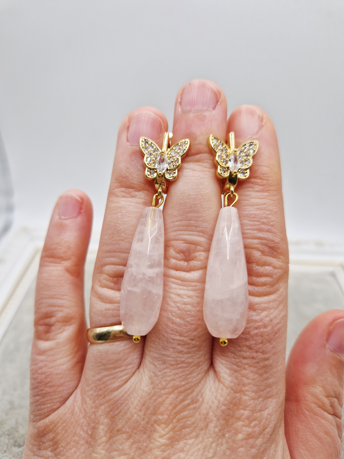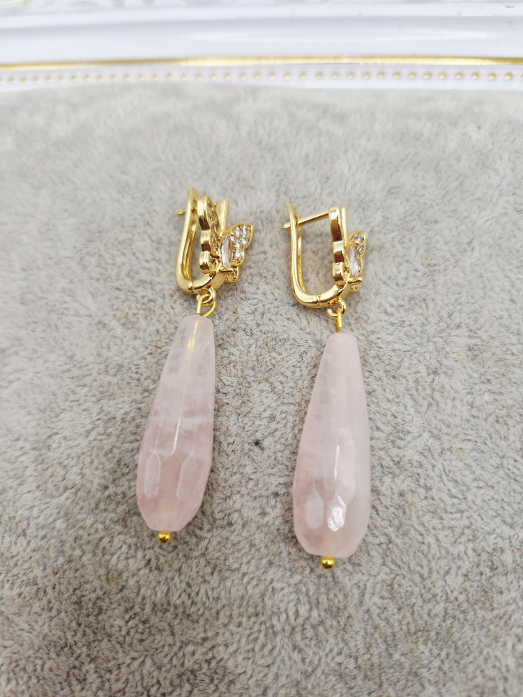 Cercei opulenti realizati din picatura de Cuart roz si tortite placate cu aur.