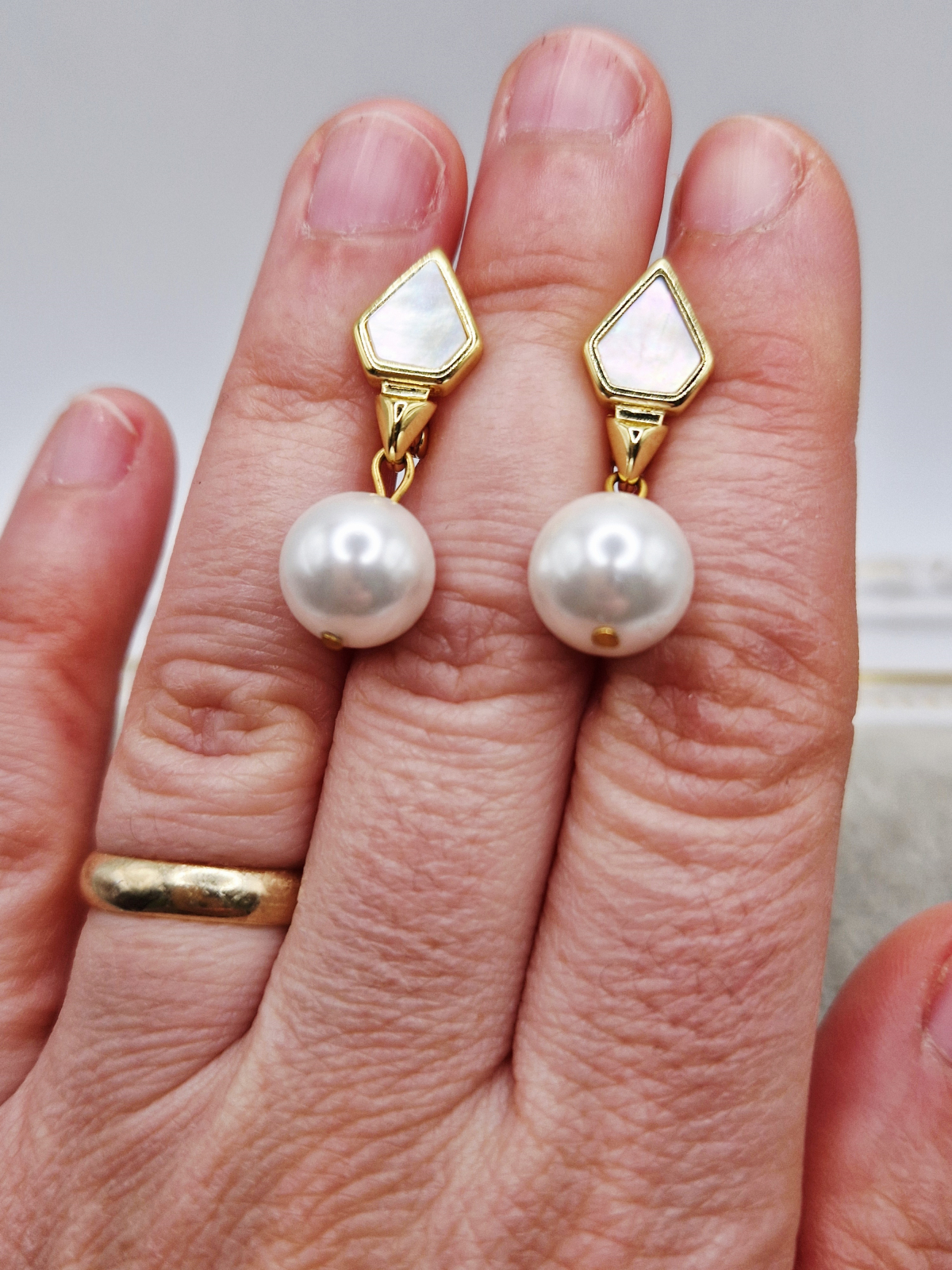 Cercei realizati din perle tip mallorca de 10mm si tortita placata cu aur cu sidef.