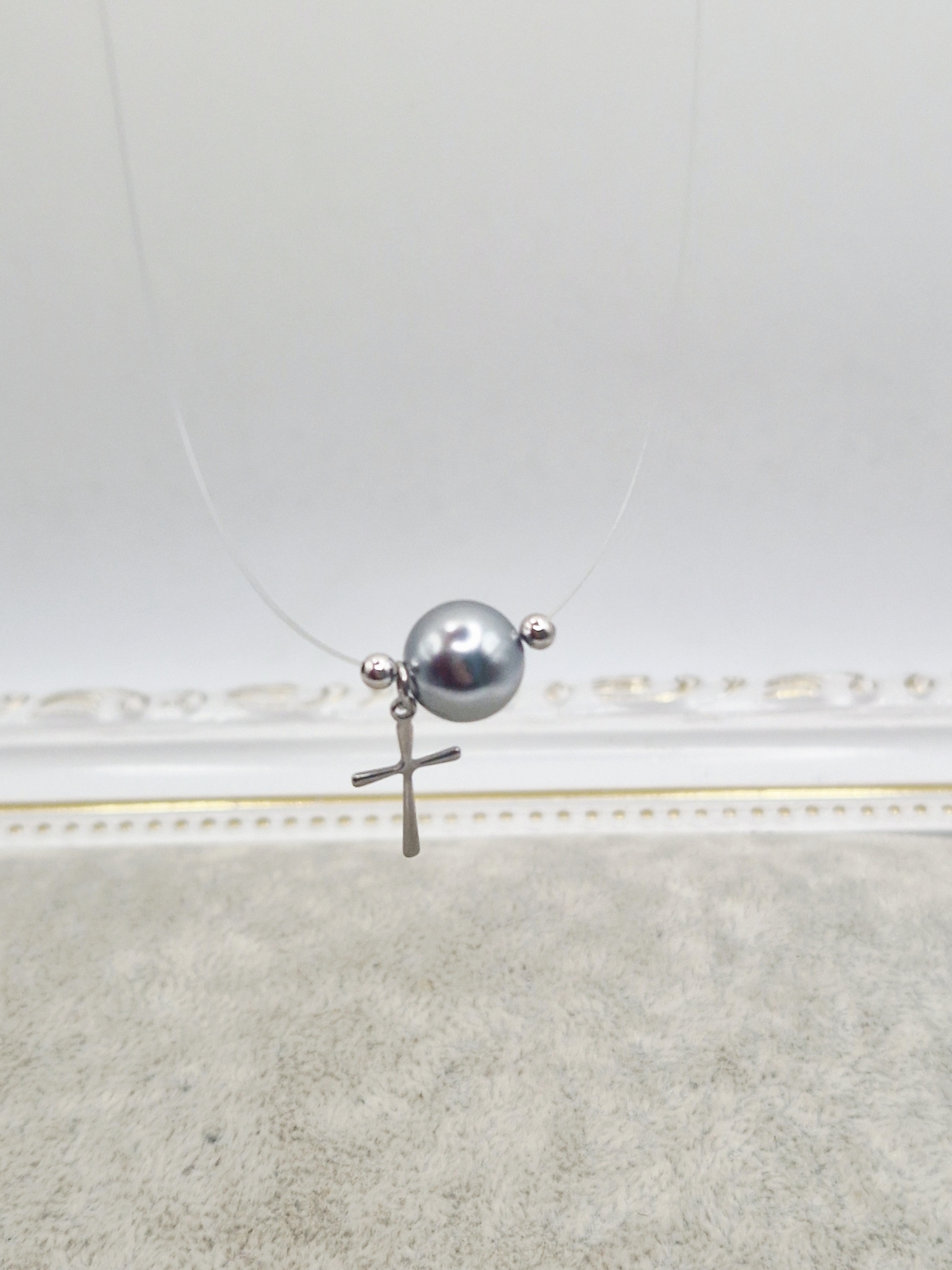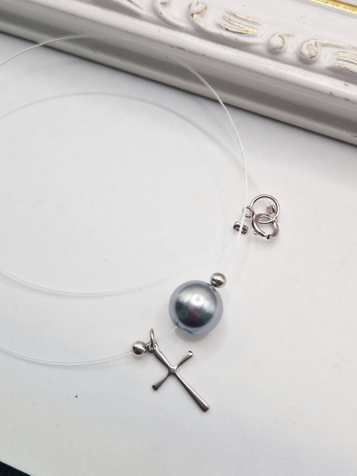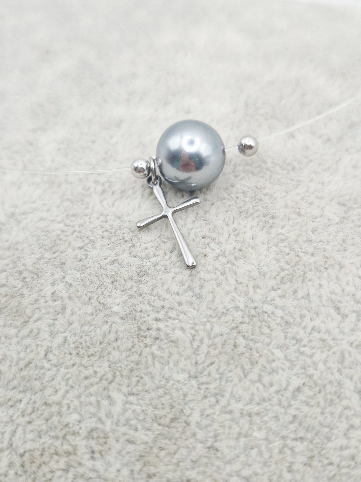 Colier la baza gatului realizat cu o feerinca perla Mallorca si elemente din argint si otel inoxidabil.