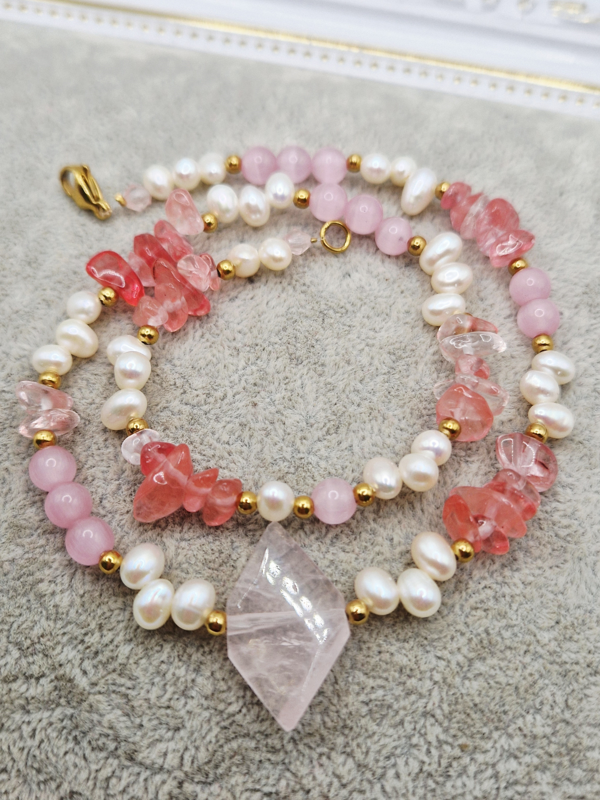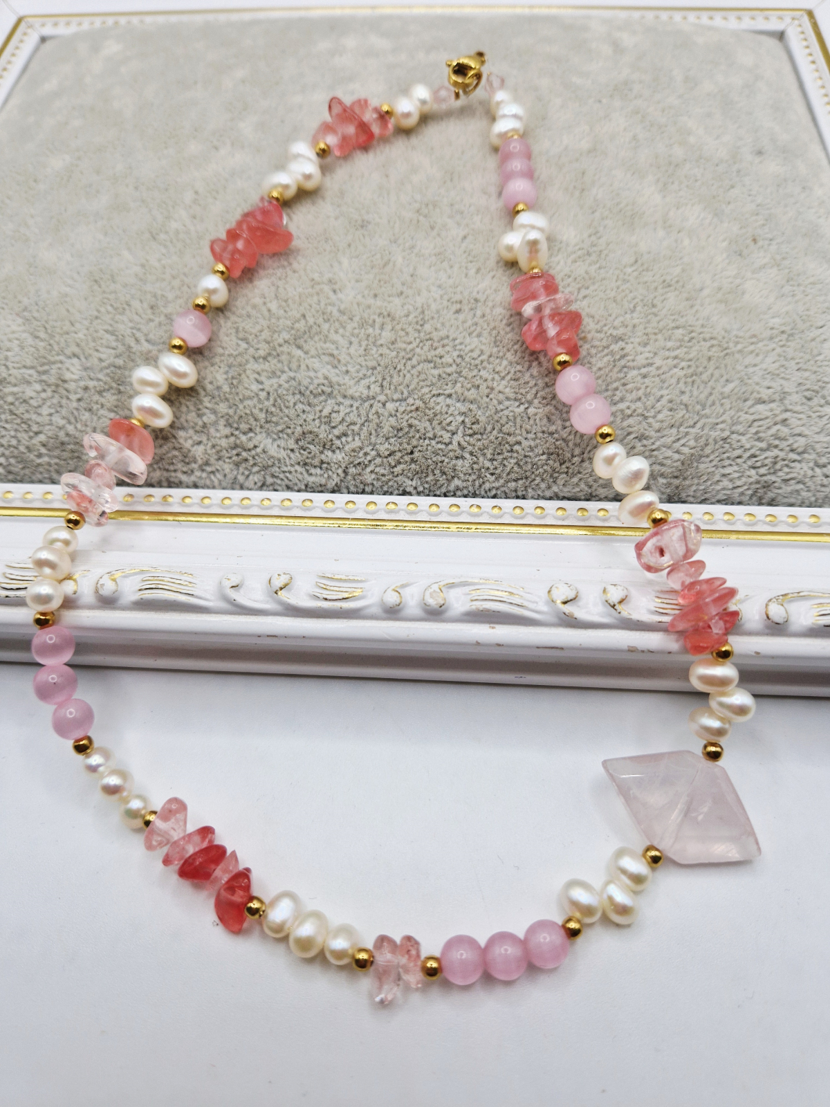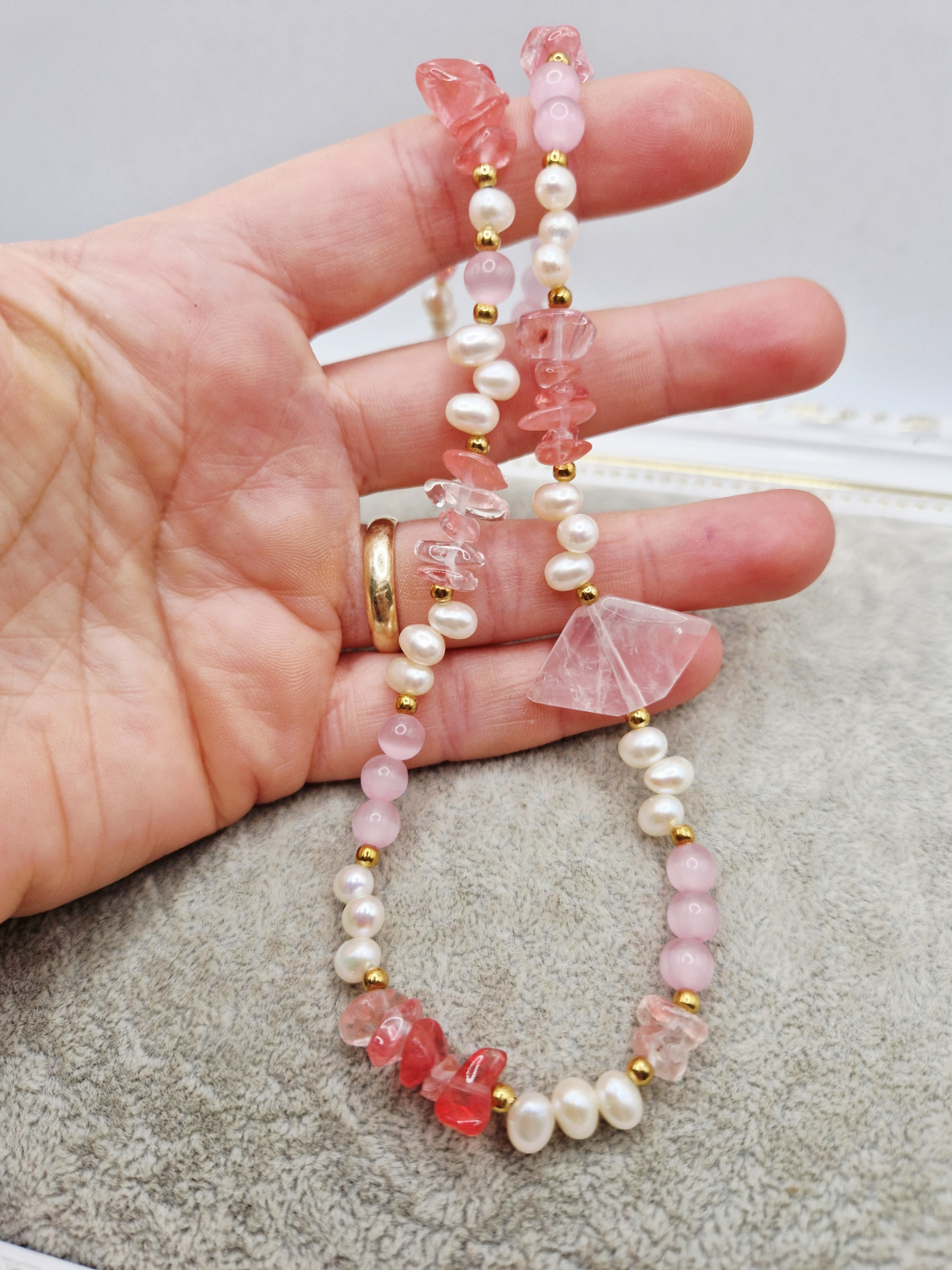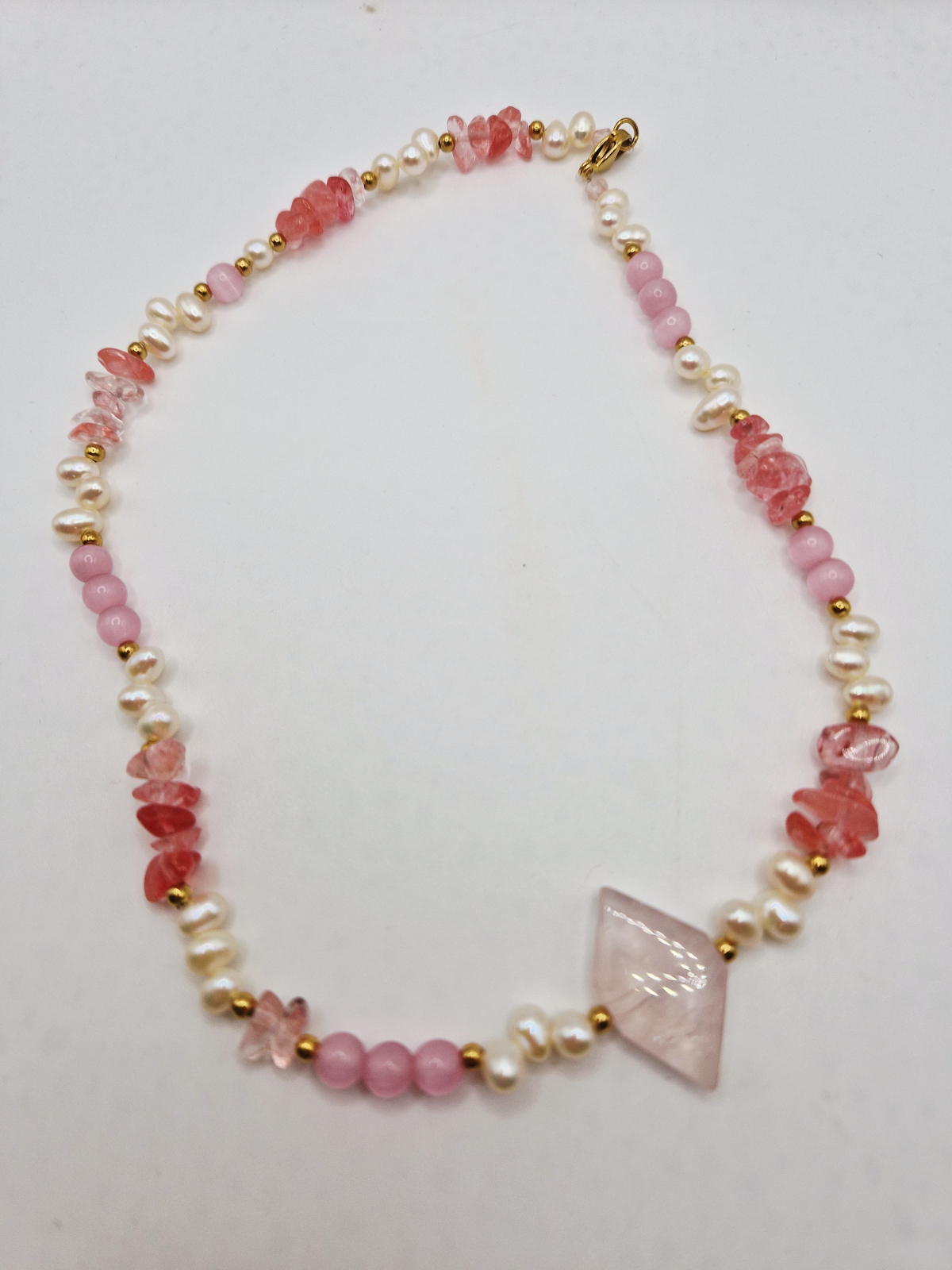 Colier jucaus din perle bob de orez, cuart roz si ochi de pisica roz.