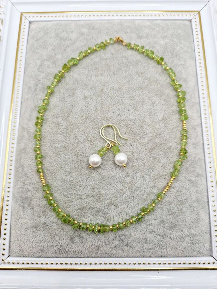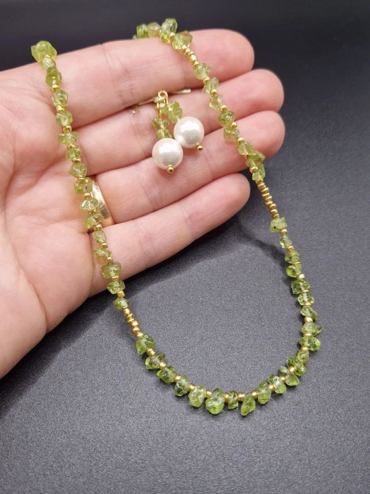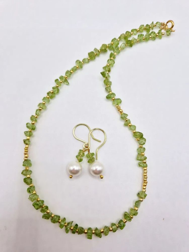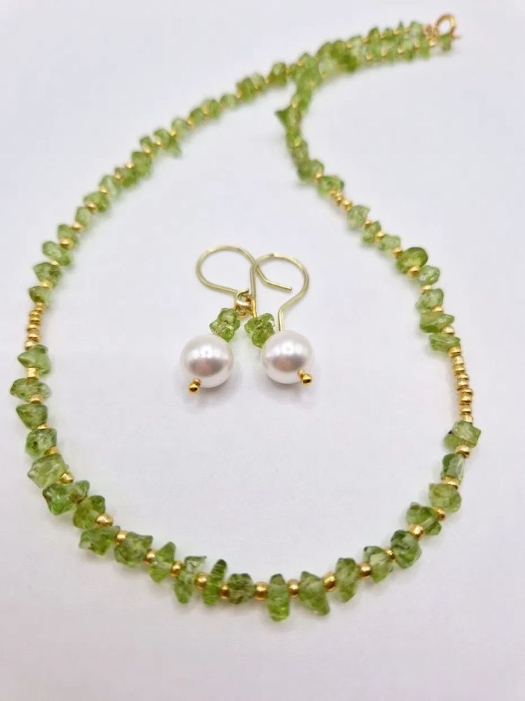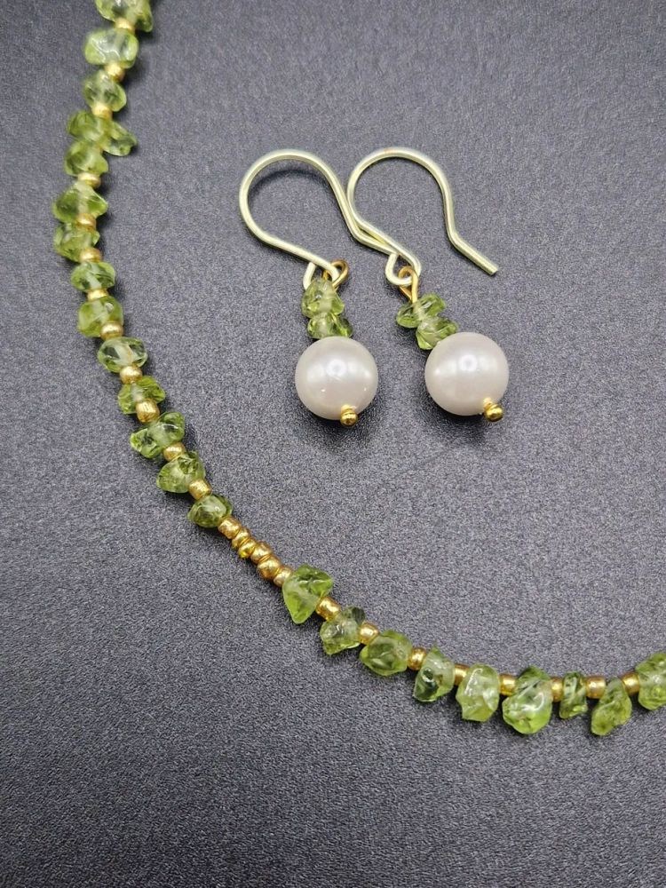 Setul este realizat din peridot, forme neregulate și cercei cu Perlă Mallorca.