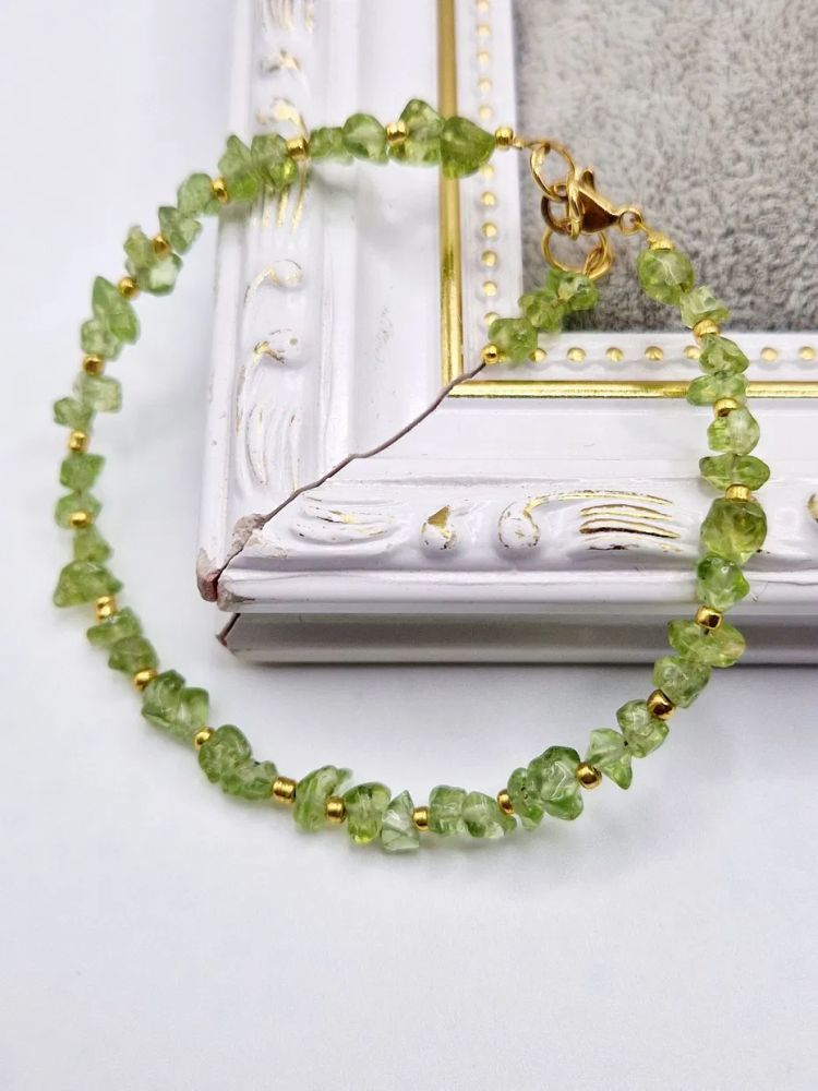 Materiale: Peridot, inox auriu, mărgele de nisip