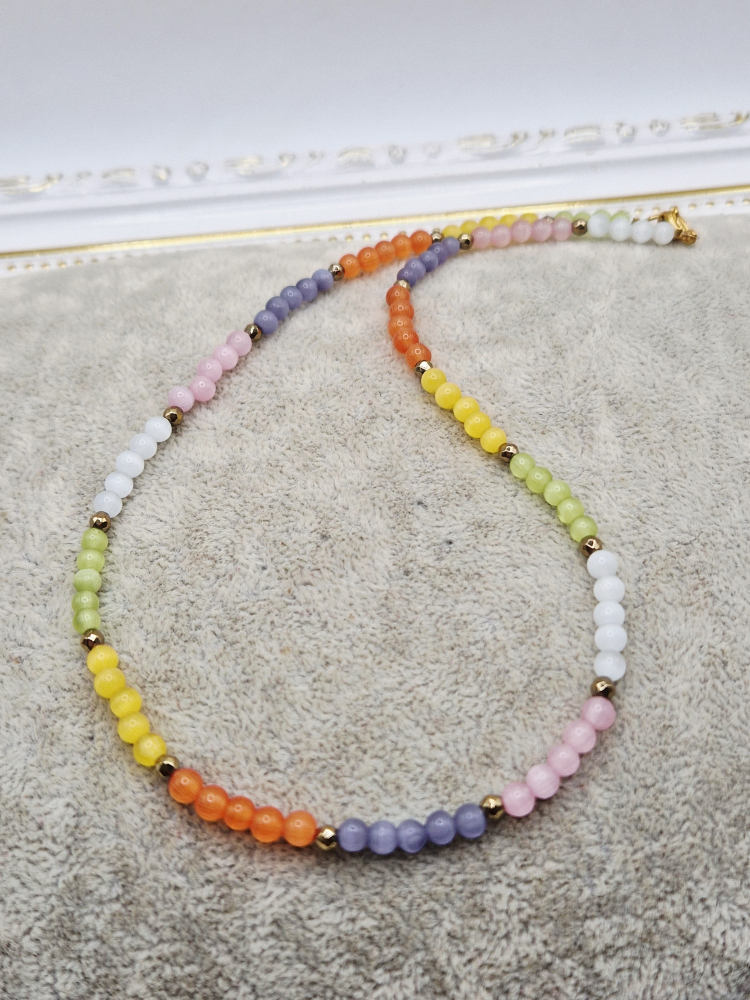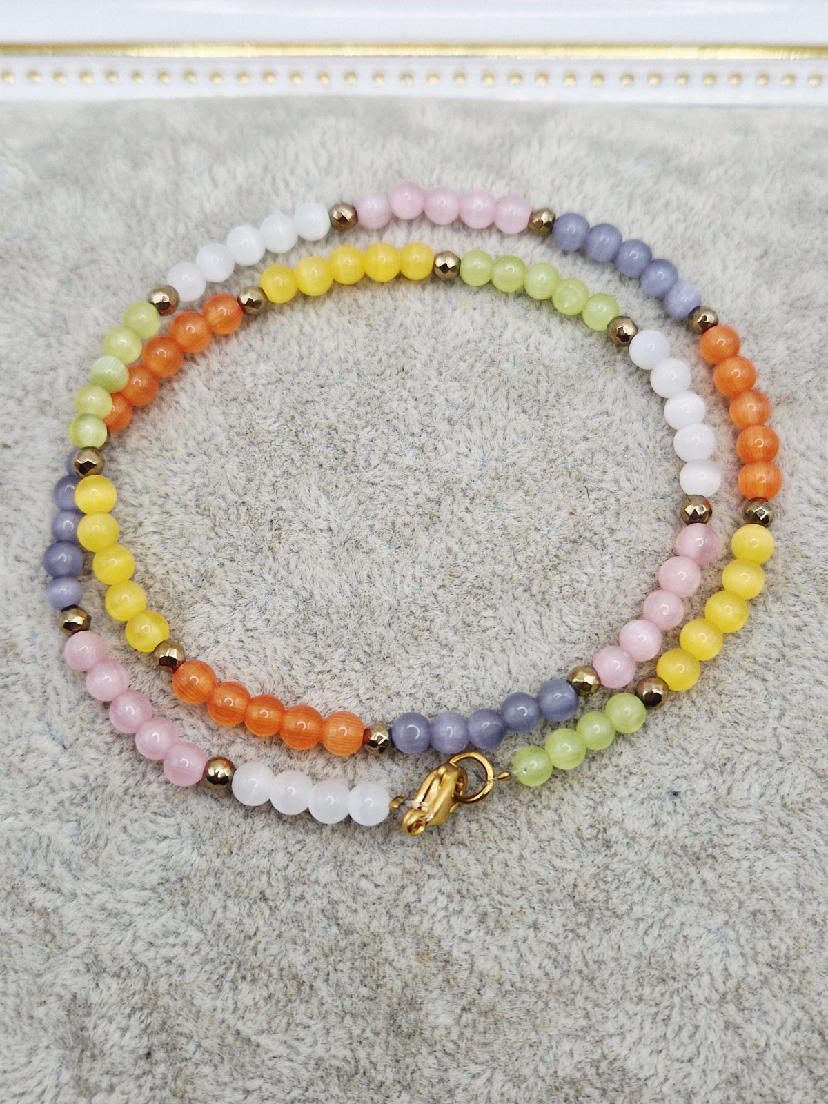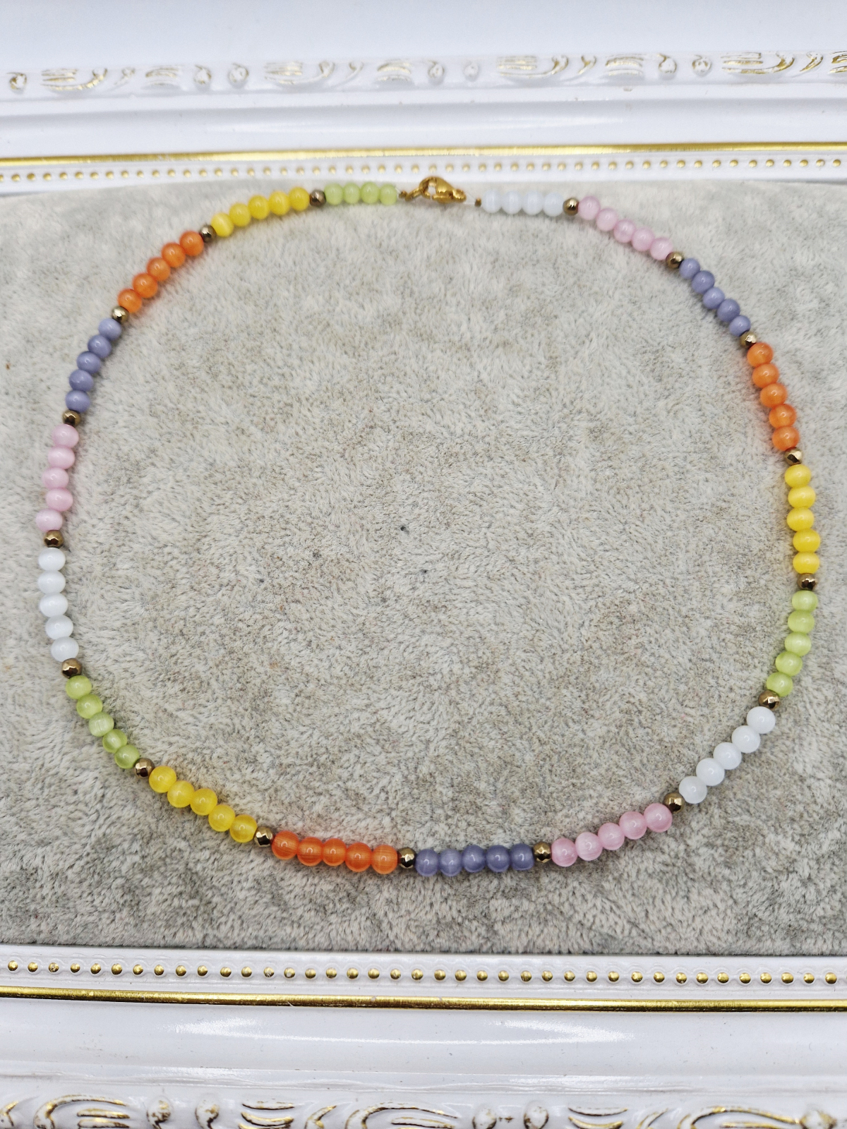 Colier delicat la baza gatului (choker) realizat din ochi de pisica in diverse culori si sfere mici de hematit auriu.