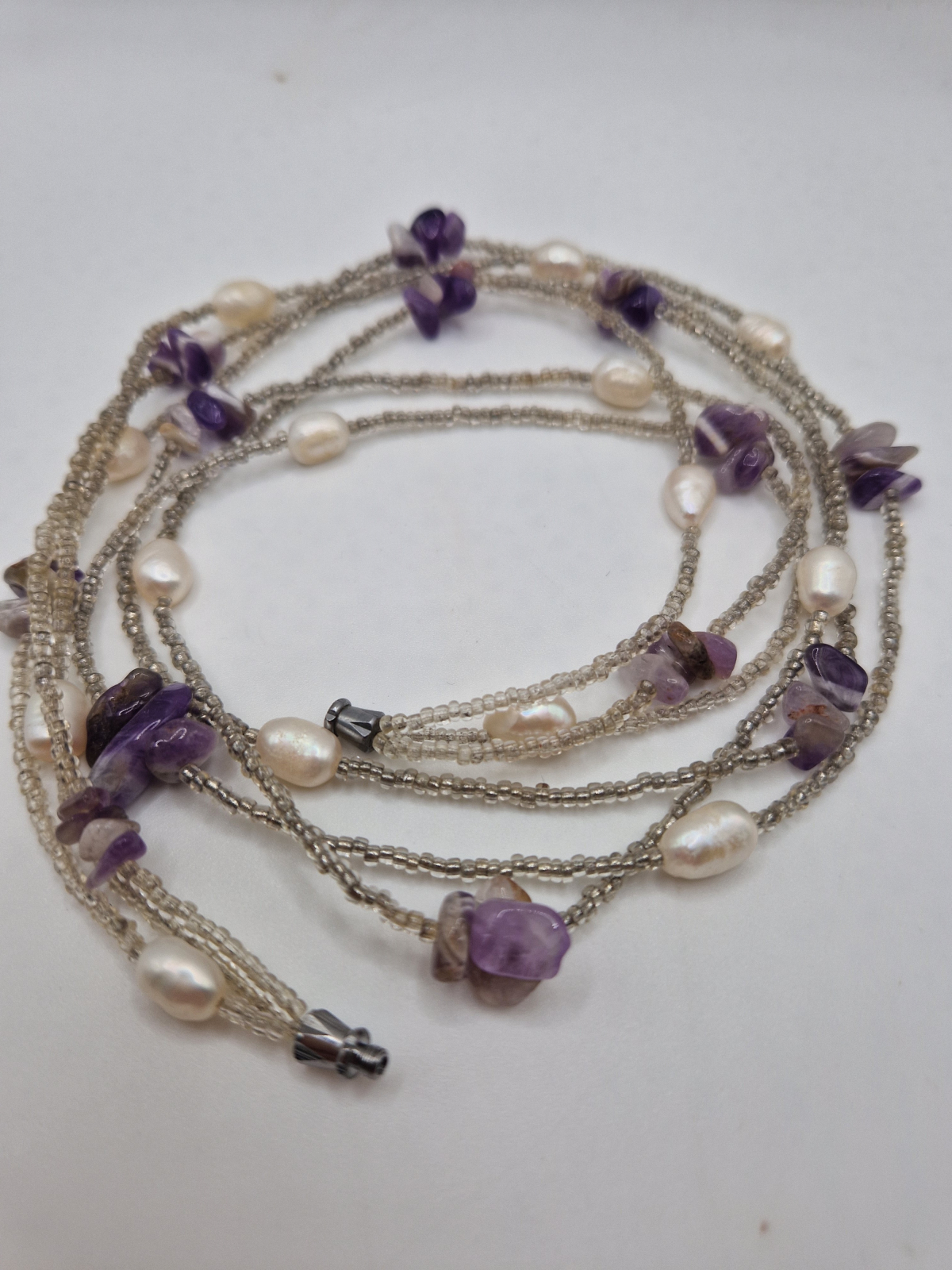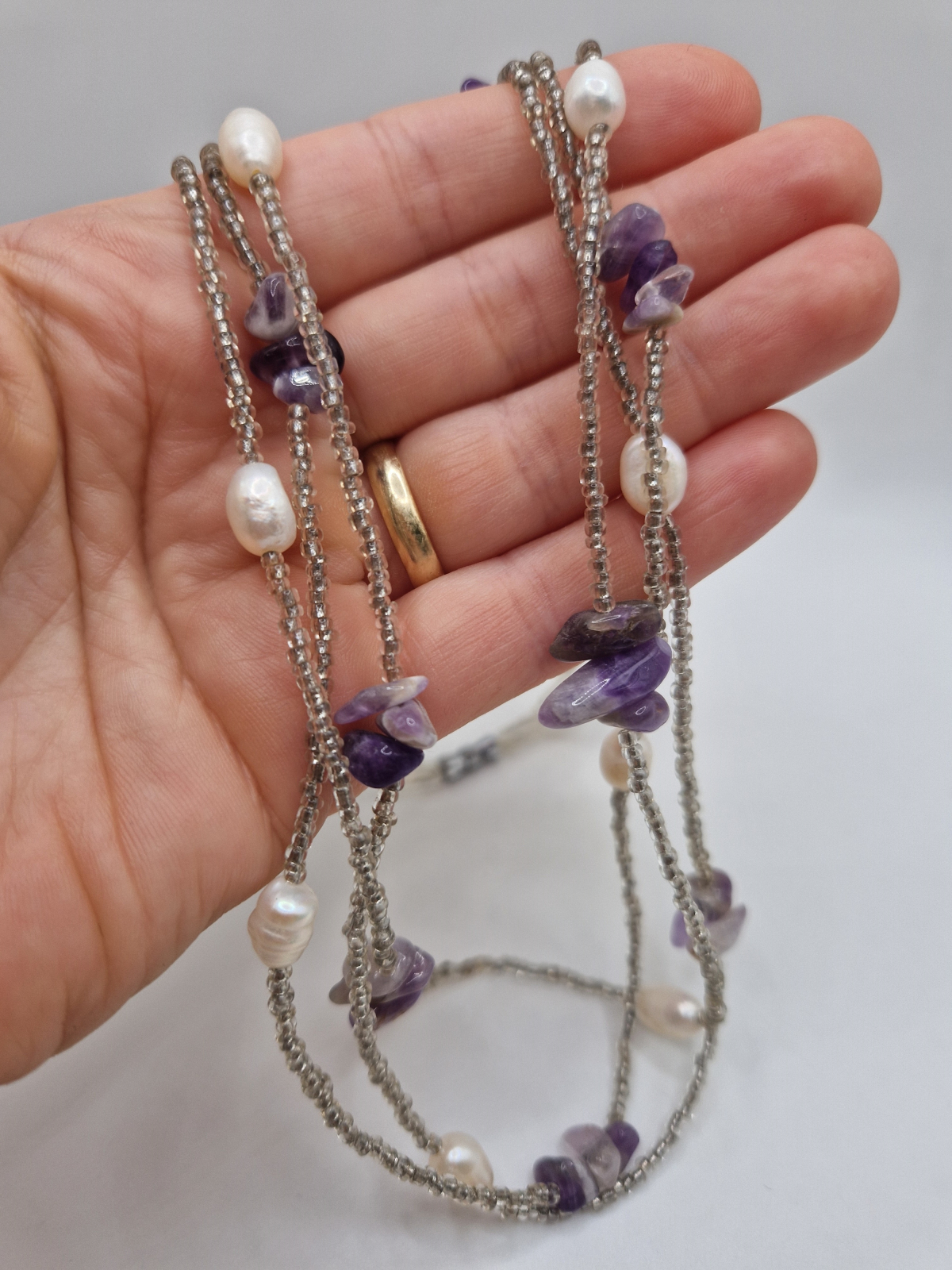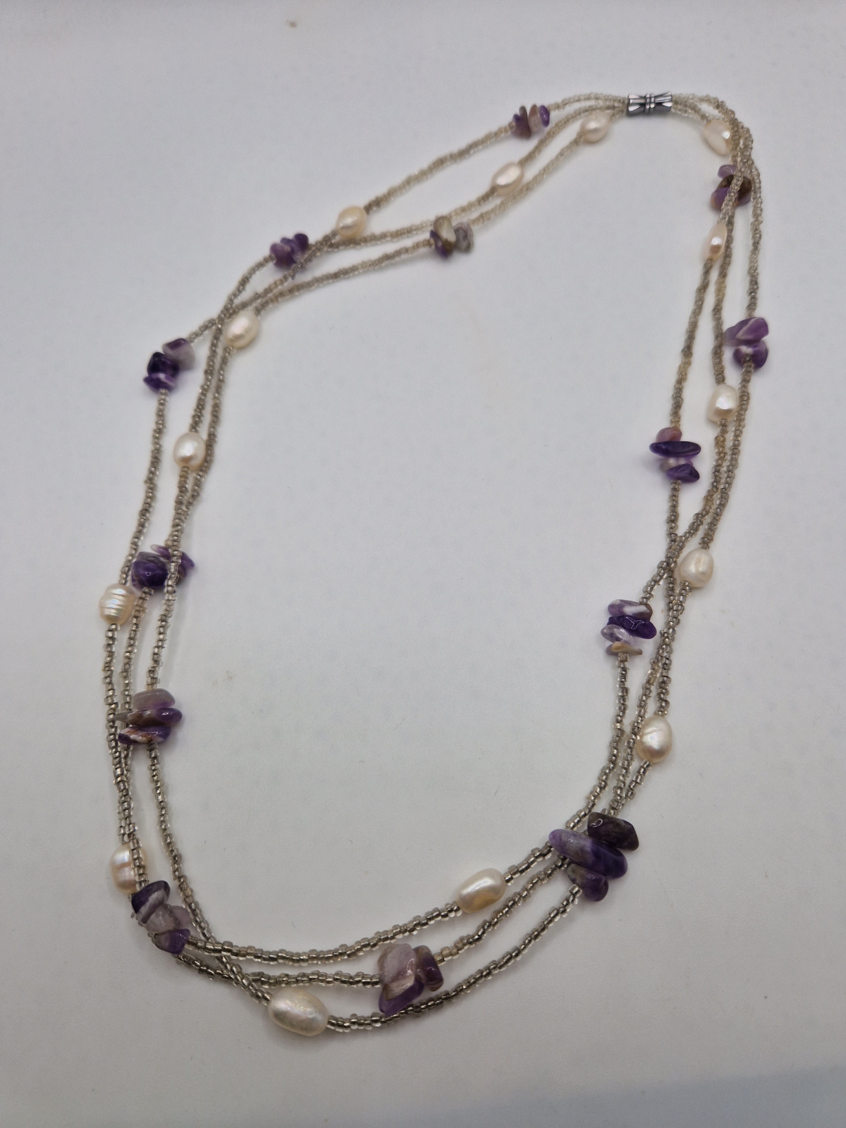 Colier realizat pe 3 fire din margele cu Perle naturale si Ametist chipsuri. Inchidere din otel inoxidabil argintiu. Lungime 55 cm Perla 8x6mm