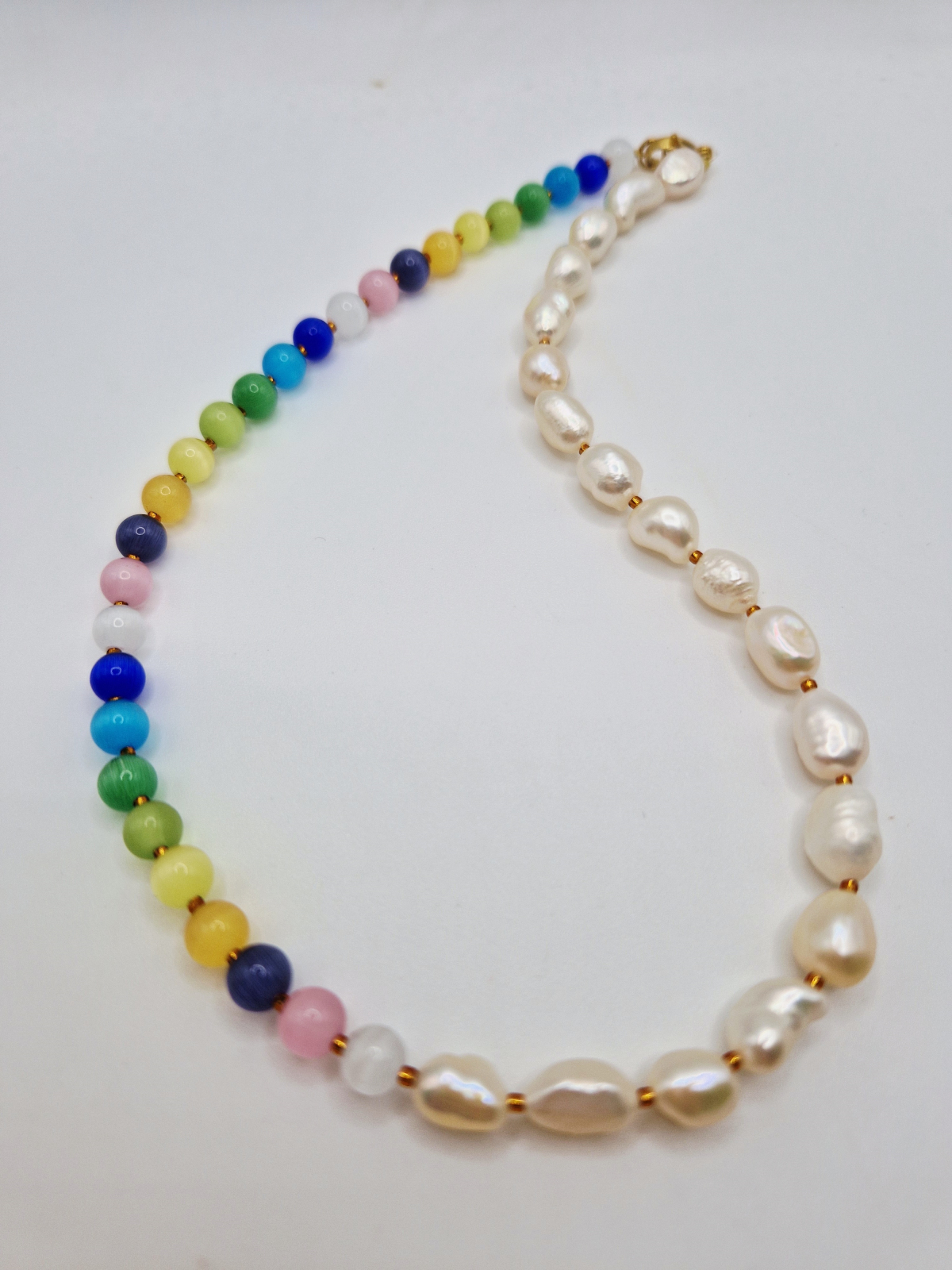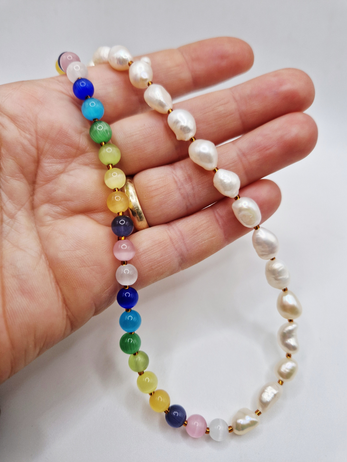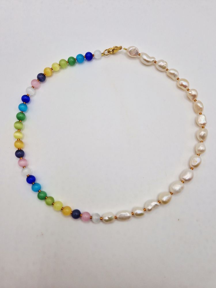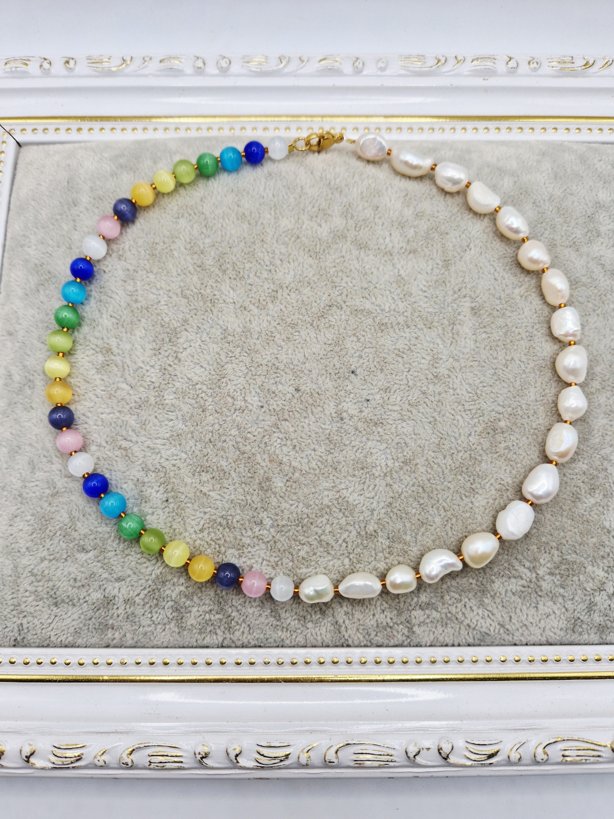 Colier delicat la baza gatului (choker) realizat din perle baroc naturale si ochi de pisica in diferite culori.
