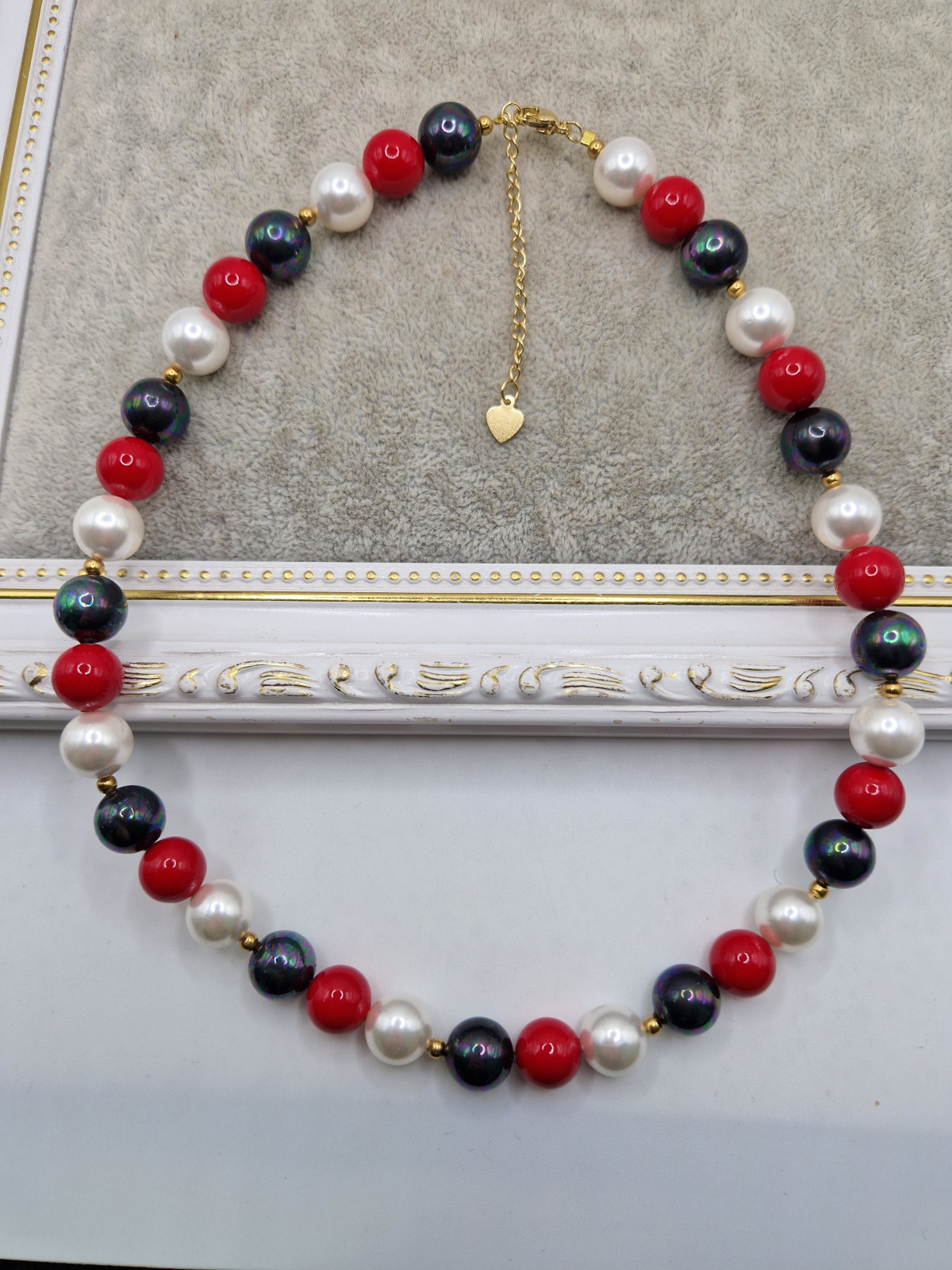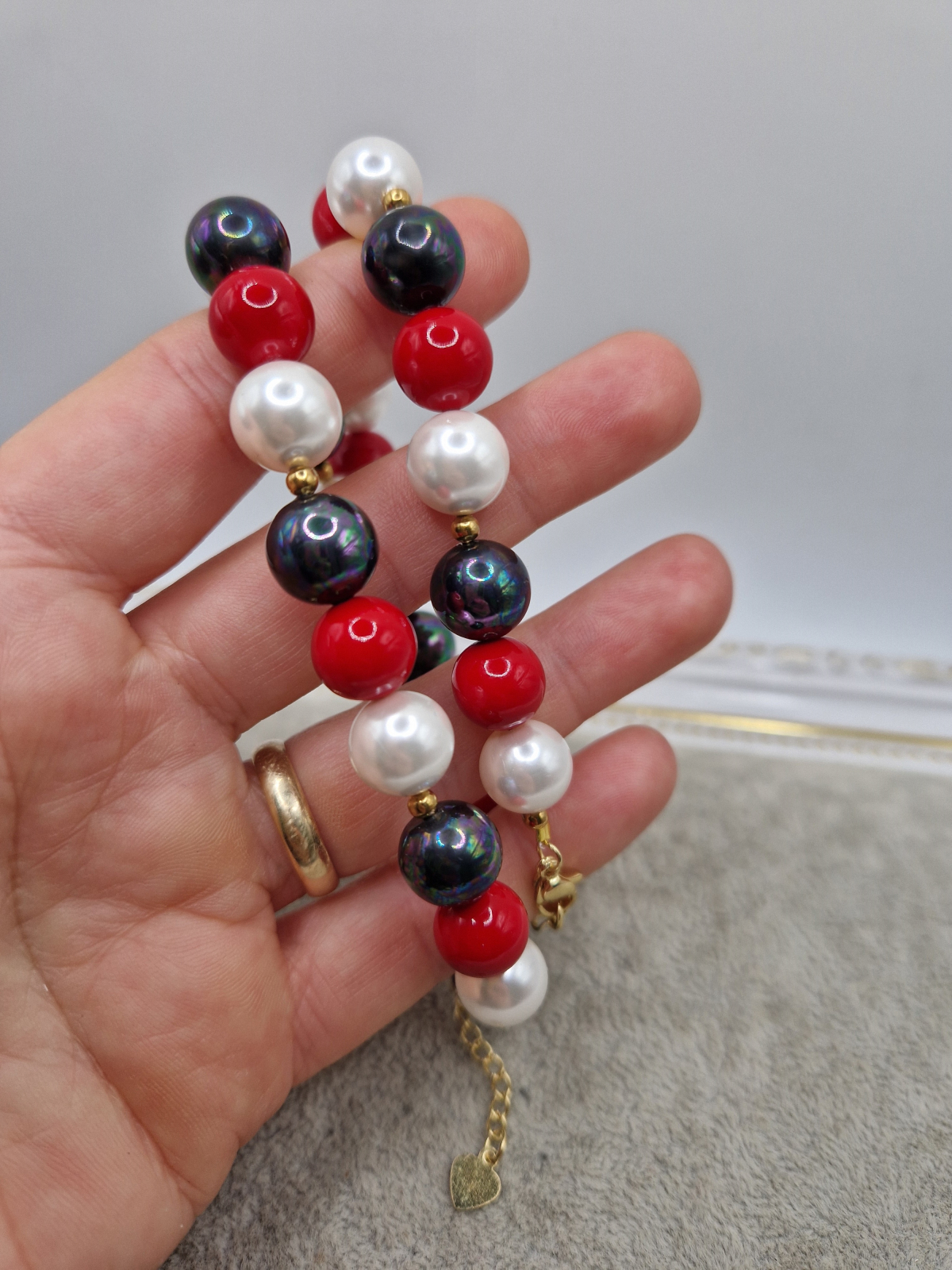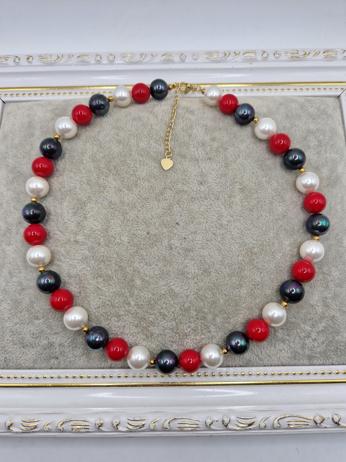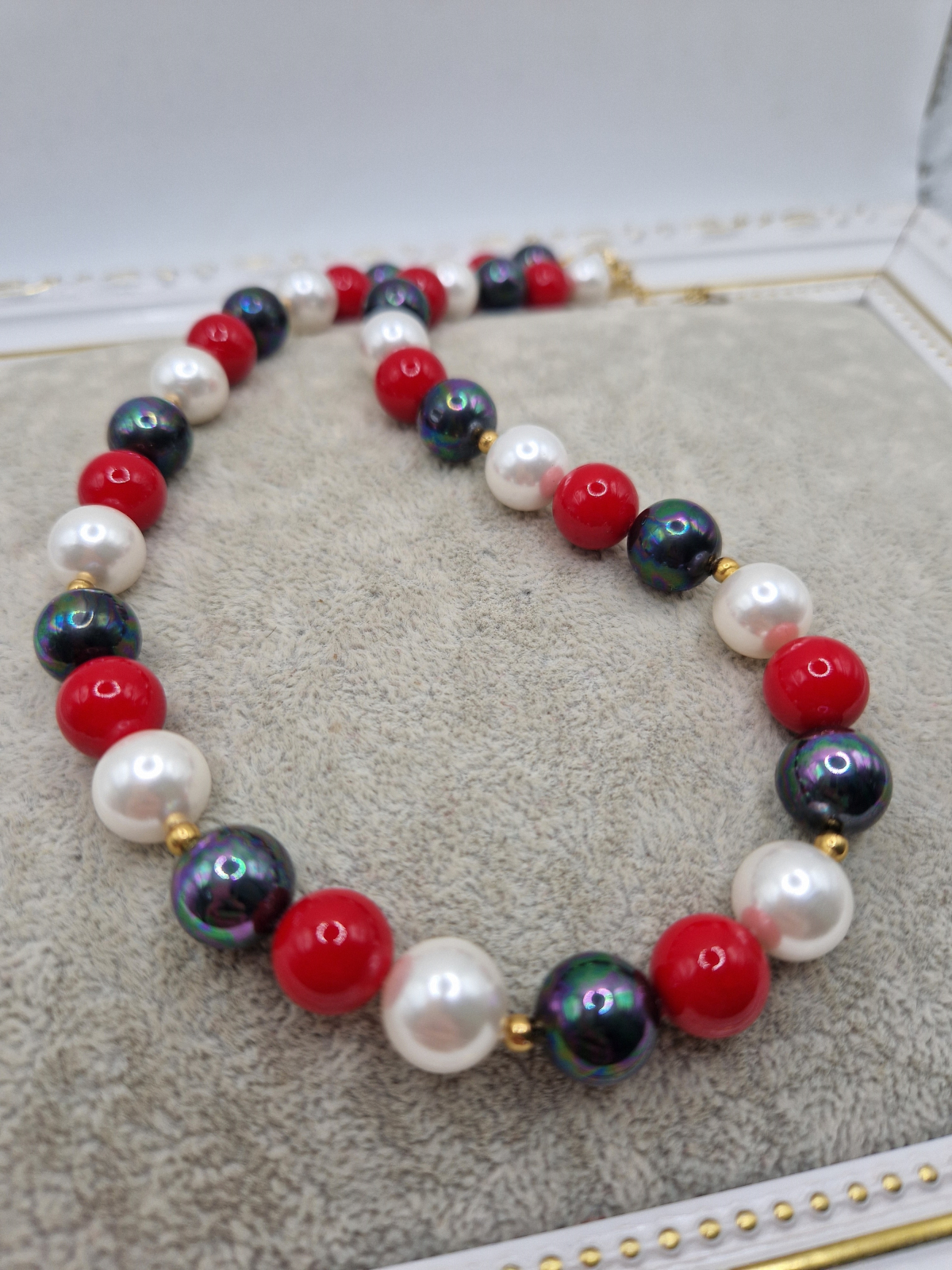 Colier realizat din Perle tip Mallorca in culorile: rosu, alb si negru.