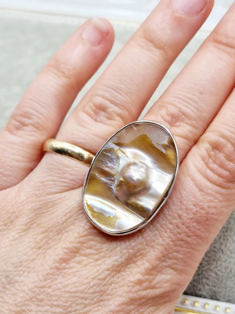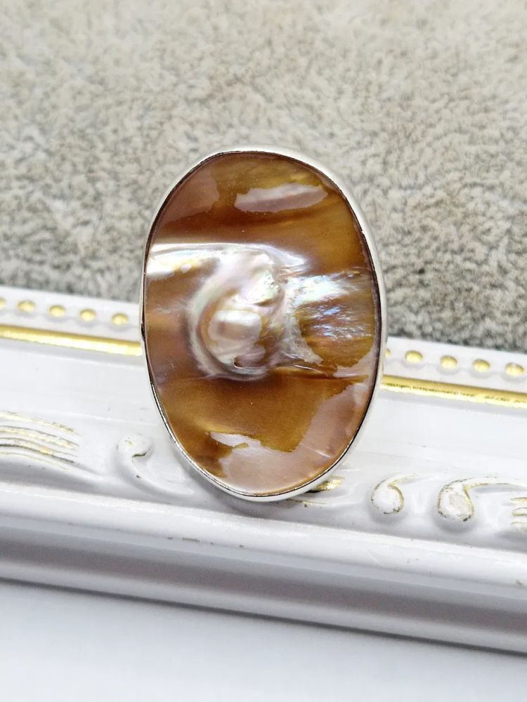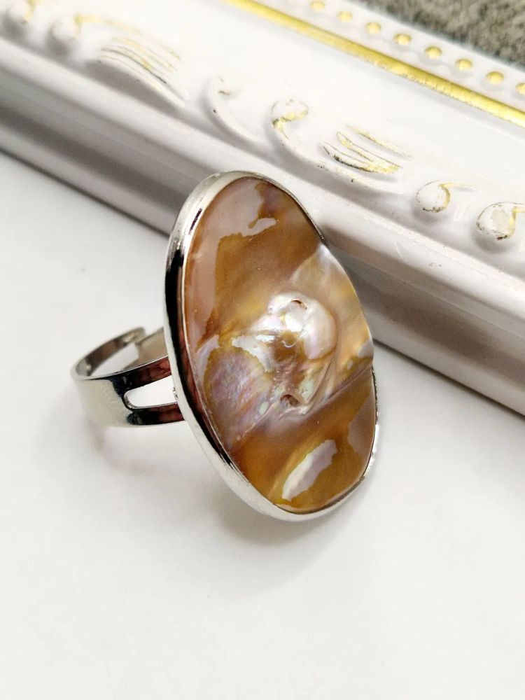 Inel reglabil oval din scoică cu perlă, în ramă argintie - 1 buc