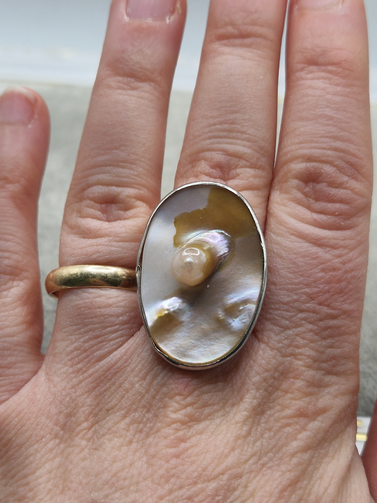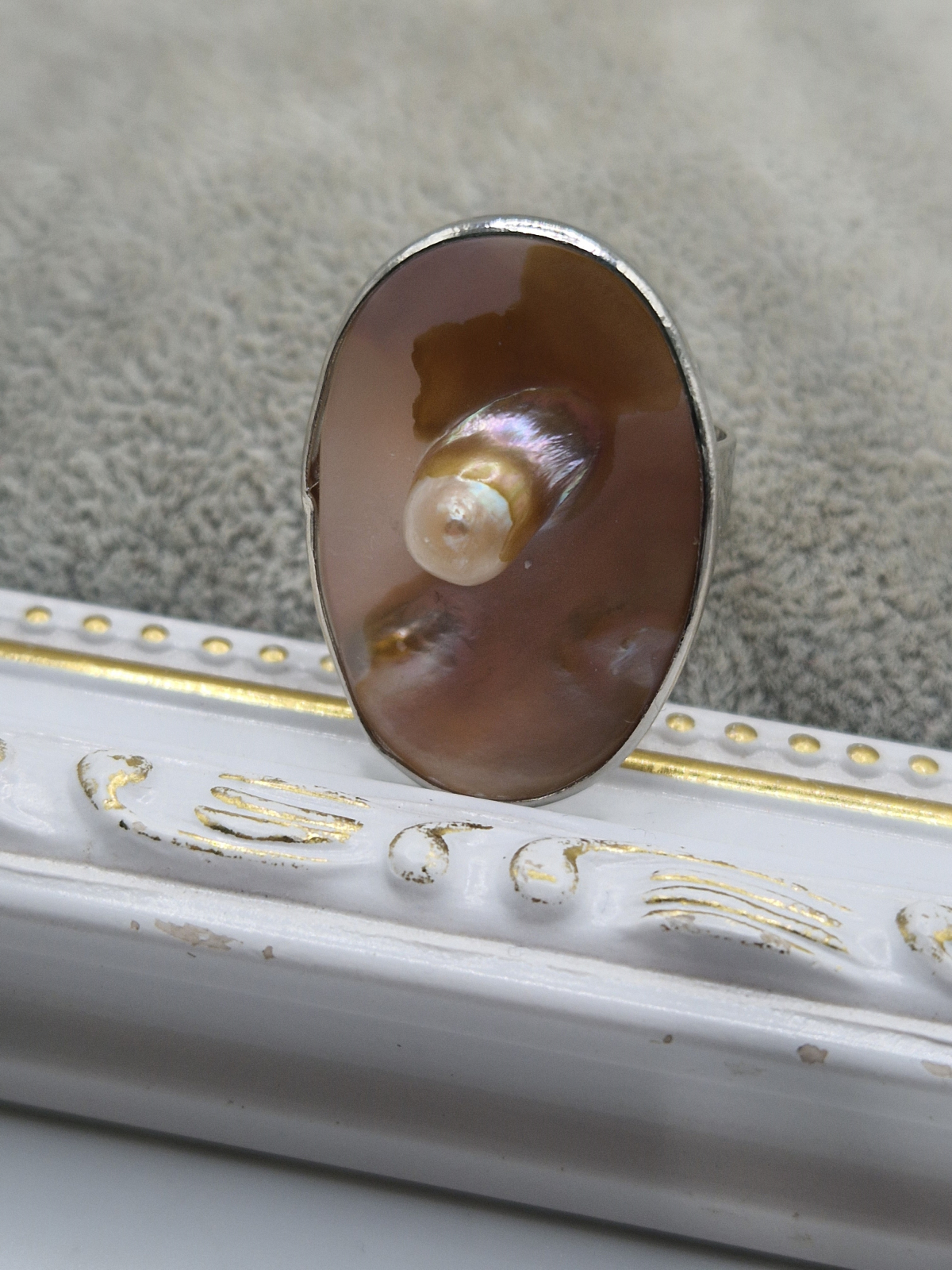 Inel reglabil din scoică cu perlă în ramă argintie.