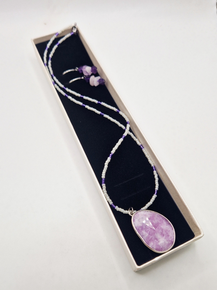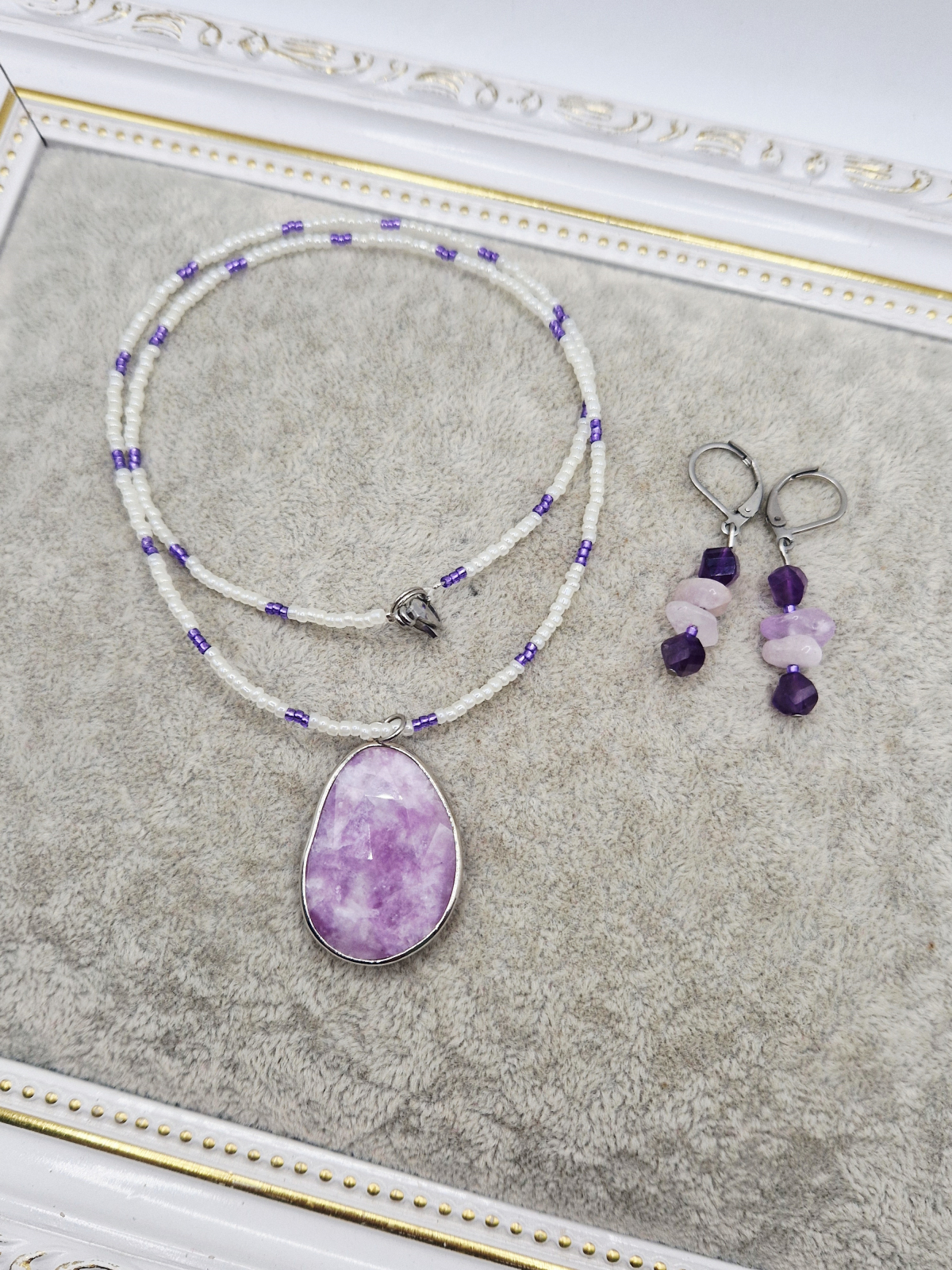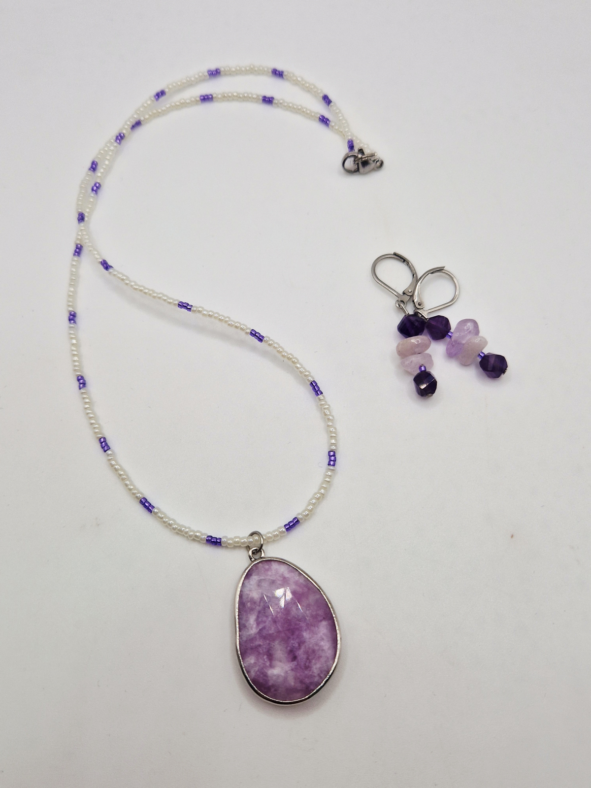Set alcatuit din Colier din margele cu pandantiv din ametist si cercei din ametist.
